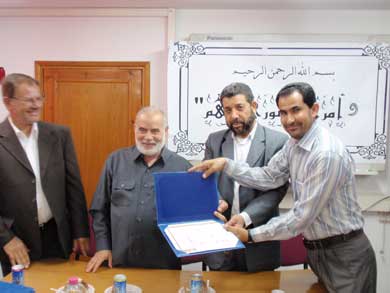 كما كرم د. بحر وحدة حماية الأجانب في جهاز الأمن والحماية على جهدها ودورها الكبير في توفير أجواء الأمن منذ وصول الوفود إلى معبر رفح وحتى إقامتهم في فنادق غزة، ومضى يقول" وجود جهاز الأمن في المعبر والفنادق أوصل للوفود شعور بالأمن والطمأنينة مما له أثر طيب على نفوس الوفود الزائرة" ووزع د. بحر شهادات شكر وتقدير ومكافئة مالية للموظفين الذين بلغ عددهم 23 موظف.