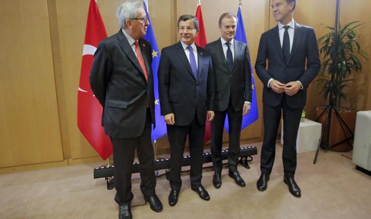 رئيس المفوضية الأوروبية جان كلود يونكر (وسط) في حديث مع أوغلو ورئيس المجلس الأوروبي دونالد توسك (أسوشيتد برس)