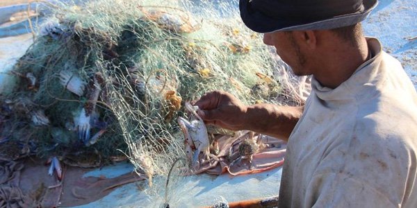 بدقة وحرفية عالية يخلّص الصياد حازم صلاح عشرات السلطعونات أو ما يعرف باسم "أبو جلمبو" التي علقت في شباك صيده، متكئا على حائط منزله الذي لا يبعد سوى 50 مترا عن البحر في منطقة الشاطئ غرب مدينة غزة.