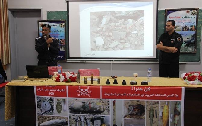 وضمن حملة توعوية نظمتها هندسة المتفجرات عن مخاطر المخلفات الحربية وبالتعاون مع مديرية تعليم شرق خان يونس، عرض المقدم سمير النجار مدير دائرة التدريب في هندسة المتفجرات القذائف والصواريخ والأجسام المشبوهة التي تجمعها إدارته من خلال تعاملها مع المخلفات التي يتركها الاحتلال خلال عدوانه المتكرر على قطاع غزة.