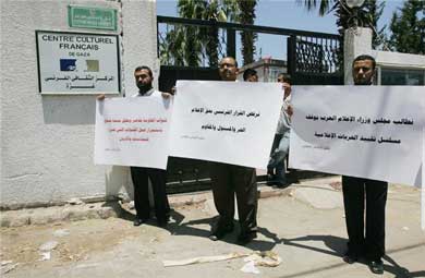 اعتصم عشرات الصحفيين الفلسطينيين ظهر الثلاثاء أمام المركز الثقافي الفرنسي بغزة تضامناً مع فضائية الأقصى واستنكاراً لقرار إدارة قمر "يوتل سات" الفرنسي بوقف بثها.