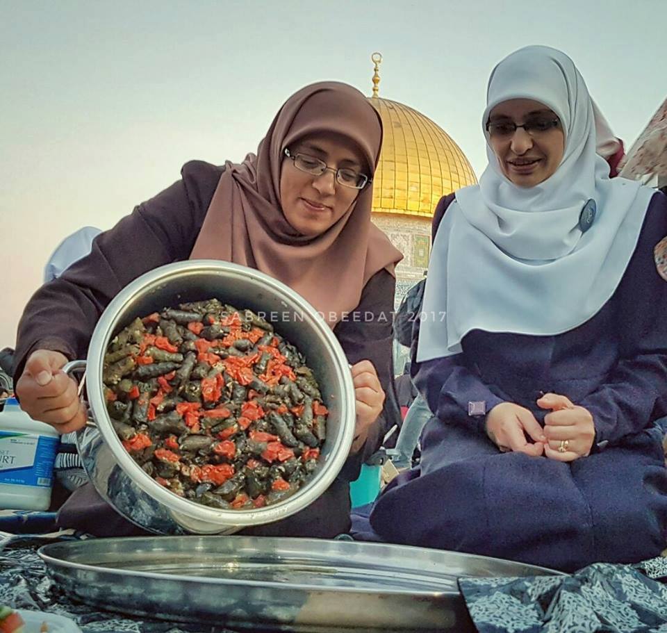 وعلى مائدة أخرى، افترشت مجموعة من الفتيات من الضفة الغربية الأرض، واجتمعوا حول مائدة الإفطار الرمضانية، ونسمات الهواء الباردة تلاطفهن، وكأن هواء القدس يخبرهن بشوقه لأهله المحرومين من زيارته.