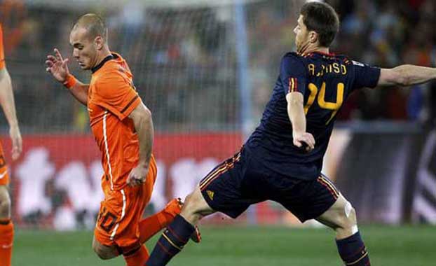 وبعدها استفاقت الطواحين الهولندية من سباتها عندما قاد اللاعب ويسلي شنايدر - شريك فيا في لقب هداف البطولة برصيد خمسة أهداف- تنفيذ الهجمة الأولى لهولندا في الدقيقة 18 و سدد كرة قوية من ضربة حرة مباشرة تصدى لها بثبات حارس الريال إيكر كاسياس.