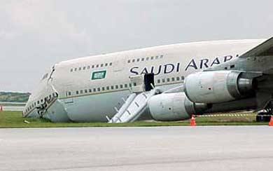 حادث غريب شهده مطار القاهرة اليوم السبت لطائرة تابعة للخطوط الجوية السعودية قبل إقلاعها مباشرة وأثناء تحركها فوق الممر في طريق عودتها إلى جدةوذلك عندما حدث كسر مفاجئ بالمحرك الرابع للطائرة وتطاير بعض الأجزاء التي أدت إلى حدوث كسر آخر بالجزء الخلفي لجناح الطائرة الأيمن وهو ما كان يمكن ان يؤدى إلى سقوط الطائرة في حال تحليقها في الجو..