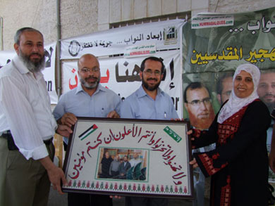 أهدت السيدة المقدسية نهى عطية من أهالي حي الشيخ جراح لوحة فنية تتوسطها صورة النواب المقدسيين ووزير شؤون القدس السابق، للنواب المقدسيين المهددين بالإبعاد في خيمة اعتصامهم.