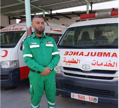 داخل طاقم الإسعاف والطوارئ في مستشفى كمال عدوان يعمل في مهنة المخاطر ولم يتقاعس لحظة عن أداء واجبه كضابط إسعاف منذ 13 عاماً.