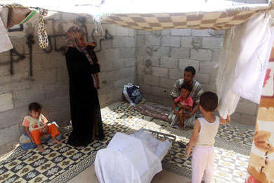 تشير "أم أحمد" إلى جدار منزلها المتهالك، وتخشى في يوم ما أن يسقط ويقع ما لا يحمد عقباه، لاسيما أن أطفالها يحتمون بظله من أشعة الشمس.