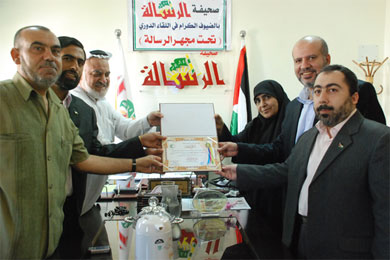 كرمت رئاسة كتلة التغيير والاصلاح البرلمانية مجلسي إدارة صحيفة الرسالة النصف اسبوعية وفلسطين اليومية المحلية تقديراً لجهودهما في الرعاية الاعلامية التي قدمتها الصحيفتين لمهرجان "الإبداع والتميز" والذي نظمته الكتلة مؤخرا لتكريم المتميزين والمبدعين والحائزين على جوائز دولية خلال ألف يوم من الحصار .
