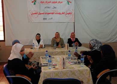 احتفل مركز شؤون المرأة بمدينة غزة اليوم باختتام دورتين تدريبيتين بعنوان "تأهيل الخريجات الجامعيات لسوق العمل", بحضور مجموعة من الخريجات الجامعيات اللواتي شاركن في التدريبين الممول من شبكة تطوير المنظمات الأهلية "NDC".