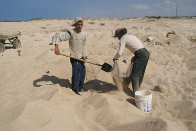 يتسلل أبو موسى وأبناء عمومته على عربتي كارو قبل أن تنسج الشمس خيوطها على شاطئ بحر شمال غزة، ورغم رهبة الموقف والخطر الذي يتربص بهم يصرون على جني رزقهم من بين براثن الموت الذي تفوح رائحته من الغبار الذي تخلفه حركة الآليات الإسرائيلية، وغربال الرمال.