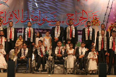 "الحمد لله .. هذا قدر الله لنا" كانت العبارات التي صدحت بها ألسنتهم في يوم عرسهم وزفافهم الميمون، ولم تفارق الابتسامة محياهم جميعاً، ثمانون جريحاً ممن أصيبوا خلال العدوان الصهيوني الغاشم على قطاع غزة المحاصر اصطفوا على مسرح الزفاف معلنين تحديهم للاحتلال وبراءتهم من الاستسلام والهزيمة.