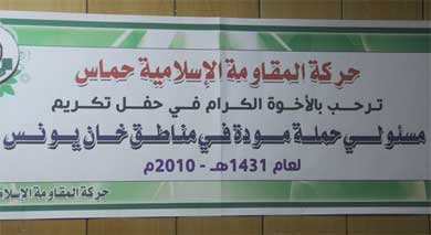 نظمت حركة المقاومة الإسلامية حماس بمحافظة خان يونس حفلا تكريما للقائمين على حملة مودة وتواصل التي أقامتها الحركة في العشر الأوائل من ذي الحجة والتي زارت من خلالها أكتر من 46 ألف منزل بخان يونس فقط .
