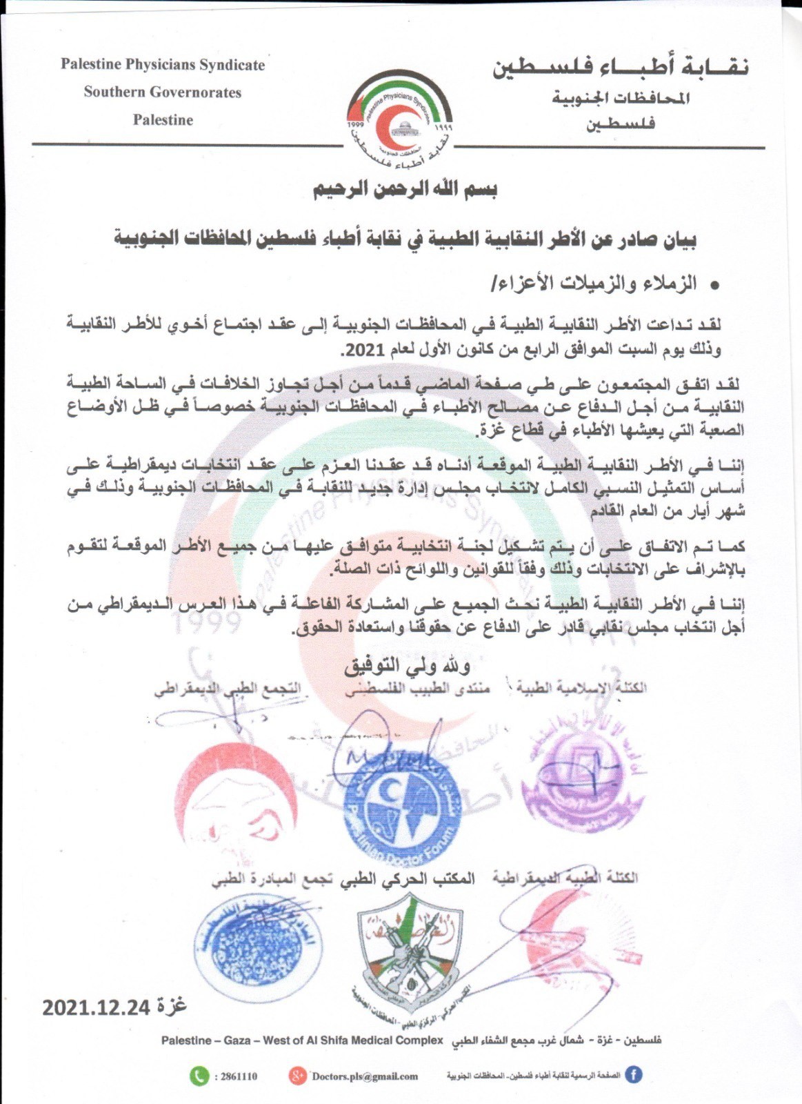 أكدت الأطر النقابية الطبية في نقابة أطباء فلسطين المحافظات الجنوبية "قطاع غزة" أنها تعتزم عـقـد انتخابات ديمقراطيـة علـى أساس التمثيل النسبي الكامل لانتخاب مجلس إدارة جديد للنقابة في المحافظات الجنوبية وذلك في شهر أيار من العام القادم.