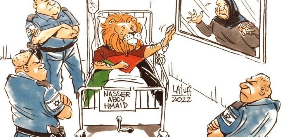 نشر الرسام البرازيلي، كارلوس لطوف، كاريكاتيراً يعبر فيه عن التدهور الخطير لصحة الأسير الفلسطيني المريض بالسرطان، ناصر أبو حميد.