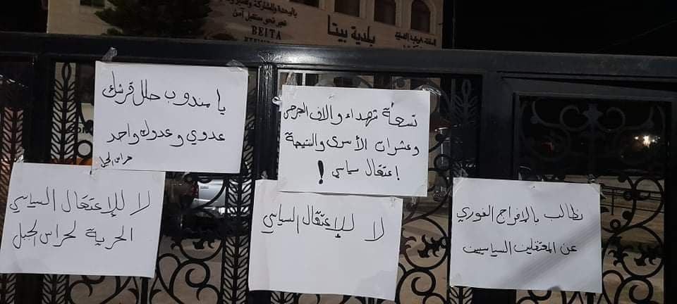 وأضافت "نستهجن تصرف الأجهزة الامنية، وننظر بعين الخطر الشديد إلى ما تقوم به الأجهزة الامنية من اعتقالات لشباب بيتا، ندعو رئيس السلطة أبو مازن وأعضاء اللجنة التنفيذية لمنظمة التحرير للتحرك فوراً لكف أيدي الاجهزة الامنية عن بيتا وشبابها".