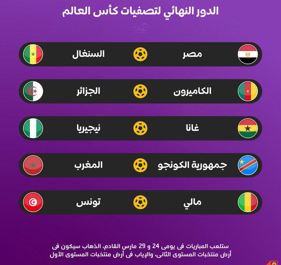 وتسعى المنتخبات العربية، الجزائر وتونس، والمغرب، ومصر لحجز بطاقة العبور للمونديال رغم صعوبة المهمة.