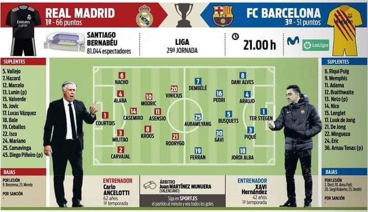ووفقًا لصحيفة “سبورت” الإسبانية، فإن التشكيلة المتوقعة للكلاسيكو، كالآتي: