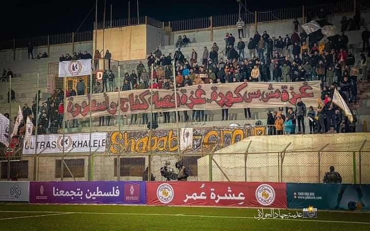 ووجهت جماهير شباب الخليل العديد من الرسائل الوطنية التي كتبتها على لافتات كبيرة دعماً للأسرى في سجون الاحتلال وتأكيداً على أن حب غزة لا يكون فقط في كرة القدم بل لأنها "قصة كفاح وأسطورة".