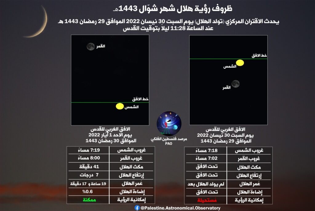 أوضح مرصد فلسطين الفلكي السبب وراء أن يصادف يوم الاثنين المقبل أول أيام عيد الفطر المبارك.