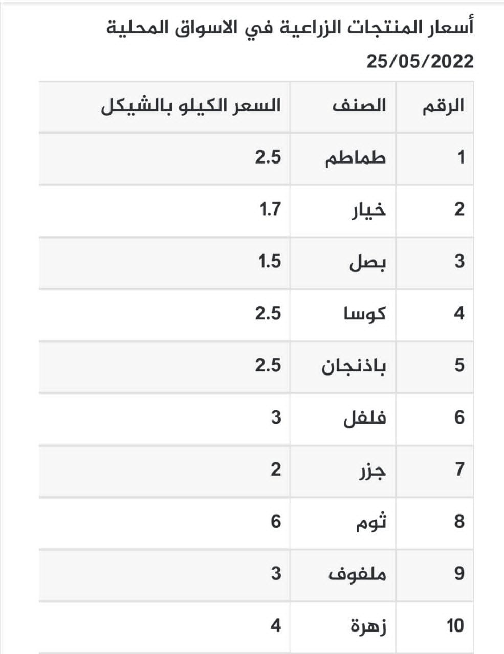 ارتفع سعر الطماطم والدجاج في القطاع صباح اليوم الأربعاء، ووفقاً لنشرة وزارة الزراعة في غزة جاءت الأسعار على النحو التالي: