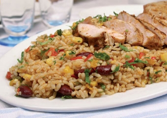 .7 ضعي الأرز في طبق التقديم و فوق قطع الدجاج ثم صبي عليها الخلطة.ش