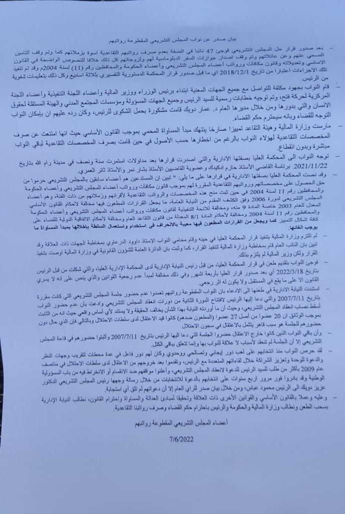 وأوضح أنه "بعد صدور قرار حل المجلس التشريعي فوجئ 47 نائبا في الضفة بعدم صرف رواتبهم التقاعدية أسوة بزملائهم كما وتم وقف التأمين الأساسي وتعديلاته وقانون مكافآت ورواتب أعضاء المجلس التشريعي وأعضاء الحكومة والمحافظين رقم (11) لسنة 2004، وقد تم تنفيذ تلك الاجراءات اعتبارا من تاريخ 1/12/ 2018، أي ما قبل صدور قرار المحكمة الدستورية التفسيري بثلاثة أسابيع، وكل ذلك بتعليمات شفوية من الرئيس".
