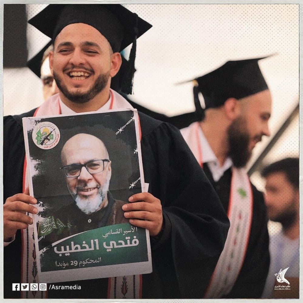 رفع الطالب في جامعة بيرزيت محمد الخصيب، صورة والده الأسير القسامي فتحي الخصيب من طولكرم، والمحكوم بالسجن المؤبد 29 مرة.