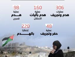 وبلغ عدد المنازل التي هدمها الاحتلال (27) منزلاً، فضلا عن عشرات المنازل التي أخطر أهلها بالهدم، إلى جانب تدمير (83) منشأة من محال تجارية ومنشآت زراعية وبركسات وغيرها.