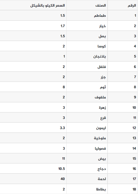جاءت أسعار الخضراوات والفواكه والدجاج واللحوم داخل أسواق قطاع غزة اليوم الأربعاء، كما يلي:
