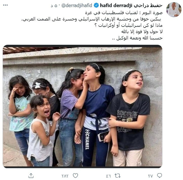 وطالب الرياضيين العرب بأخذ دورهم في ظل العدوان الجديد على غزة، مشددا على ضرورة تقديم كل أشكال الدعم للرياضيين والشعب الفلسطيني.. وتابع مرفقا كلماته بفيديو يوضح استهداف الاحتلال للمؤسسات والمنازل والبيوت: تخيل في أقل من ثانية واحدة صاروخ يدمر ماضيك وحاضرك ومستقبلك، ماذا يسعني أن أقول عن هذا الموقف الأليم؟" كما استعرض المعلق الجزائري عبر صفحته، صورة لفتيات فلسطينيات يبكين خوفا من الاحتلال (الإسرائيلي)، متسائلا: "ماذا لو كن (إسرائيليات) أو أوكرانيات؟.
