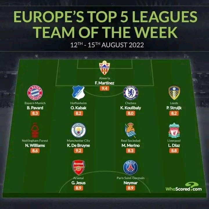 الوسط: لويس دياز (ليفربول) - مايكل ميرينو (ريال سوسيداد) - كيفين دي بروين (مانشستر سيتي) - نيكو ويليامز (نوتنجهام فورست).