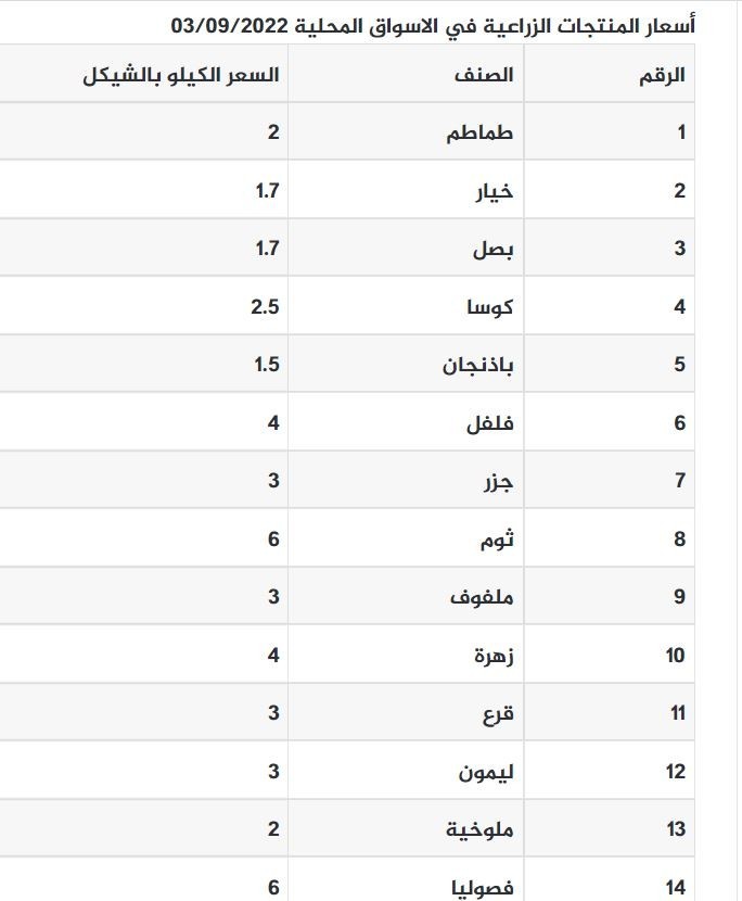 أصدرت وزارة الزراعة في قطاع غزة اليوم السبت 3 سبتمبر/ أيلول 2022 نشرة أسعار المنتجات الزراعية في السوق المحلية، لبيعها إلى المواطن.