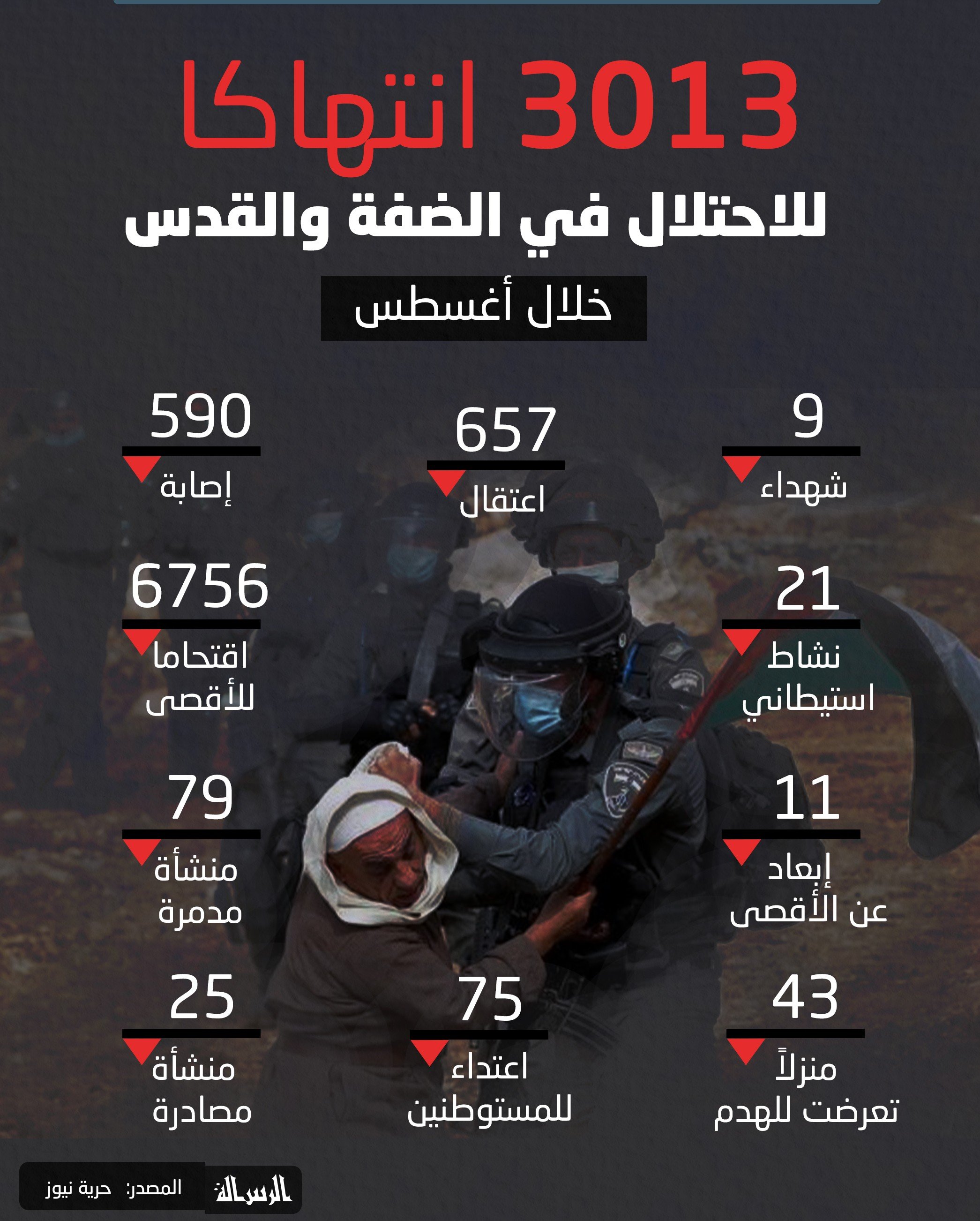 انفوجرافيك: 3013 انتهاكا في الضفة والقدس خلال أغسطس
