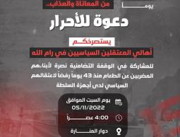 دعا أهالي المعتقلين السياسيين للمشاركة في الوقفة التضامنية مع أبنائهم المضربين عن الطعام لليوم الـ43 على التوالي، غدا السبت برام الله.