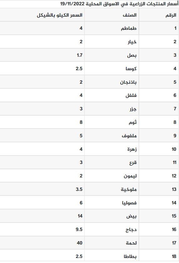 نشرت وزارة الزراعة في قطاع غزة، اليوم السبت 19 نوفمبر/ تشرين الثاني أسعار المنتجات الزراعية في السوق المحلية التي تتضمن الخضراوات والدجاج.
