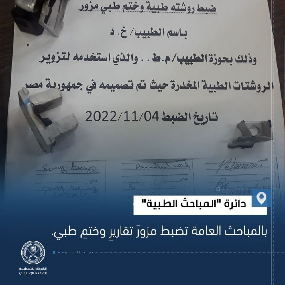 وبينت المباحث الطبية، أنها وبمراجعة الطبيب المختص لكتابة الروشتة، أنكر علمه بما تحتويه الروشتة، مؤكداً أن الروشتات مزورة، وباستجواب المذكور أقر بتزوير ختم الطبيب بالإضافة إلى تزوير عدد من الروشتات الطبية، وبيعها مقابل 30 شيكل لكل روشتة طبية.