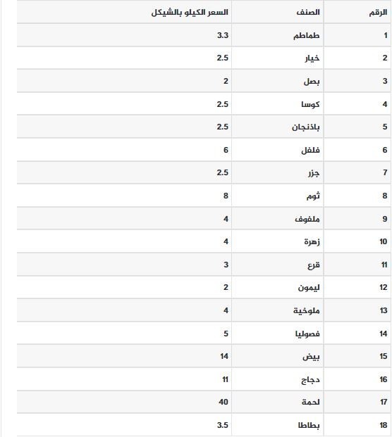 نشرت وزارة الزراعة في قطاع غزة، اليوم الأحد 11 ديسمبر 2022 متوسط أسعار المنتجات الزراعية في السوق المحلية، مشيرة إلى أنها يجب ألا تزيد عن الأسعار المدونة أدناه للمستهلك.