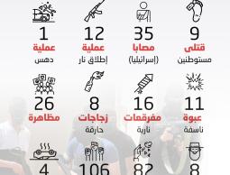 ووفقا لمركز المعلومات الفلسطيني "معطى"، فقد تم تنفيذ 12 عملية إطلاق نار في مدينة القدس، إلى جانب عملية دهس واحدة، وتفجير 11 عبوة ناسفة، و16 مفرقعات نارية.
