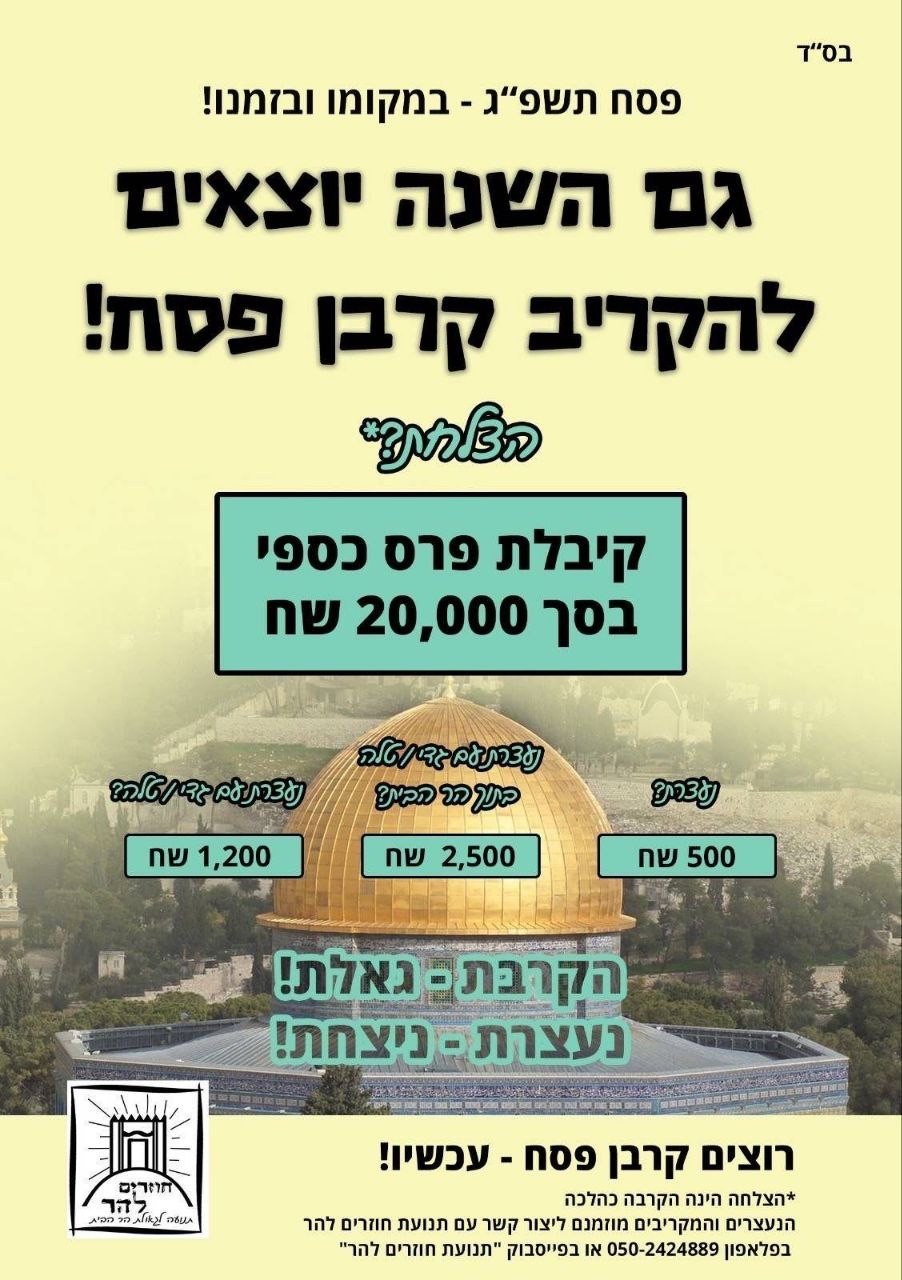 وتشكل هذه المبالغ ضعف ما أُعلن عنه من مكافآت في العام الماضي؛ وتأتي جزءاً من حملة غير مسبوقة تطلقها جماعات الهيكل لفرض قربان الفصح في المسجد الأقصى بالقوة هذا العام، وتحديداً يوم الأربعاء 5-4-2023.