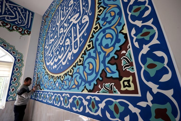 على مدار شهر من العمل المتواصل، استطاع الخطاط الفلسطيني عادل فوزي عودة (45 عاما) تحويل مسجد قرية رنتيس -غربي مدينة رام الله- إلى لوحة فنية، مزركشا إياه بآيات قرآنية وزخارف إسلامية.