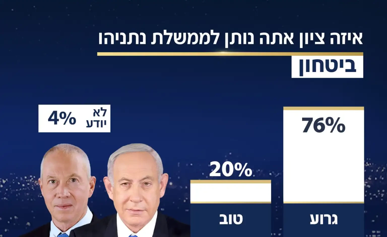 في حين يرى 60% من المصوتين لكتلة نتنياهو أن أداء الحكومة في قضية الأمن ضعيف جداً.
