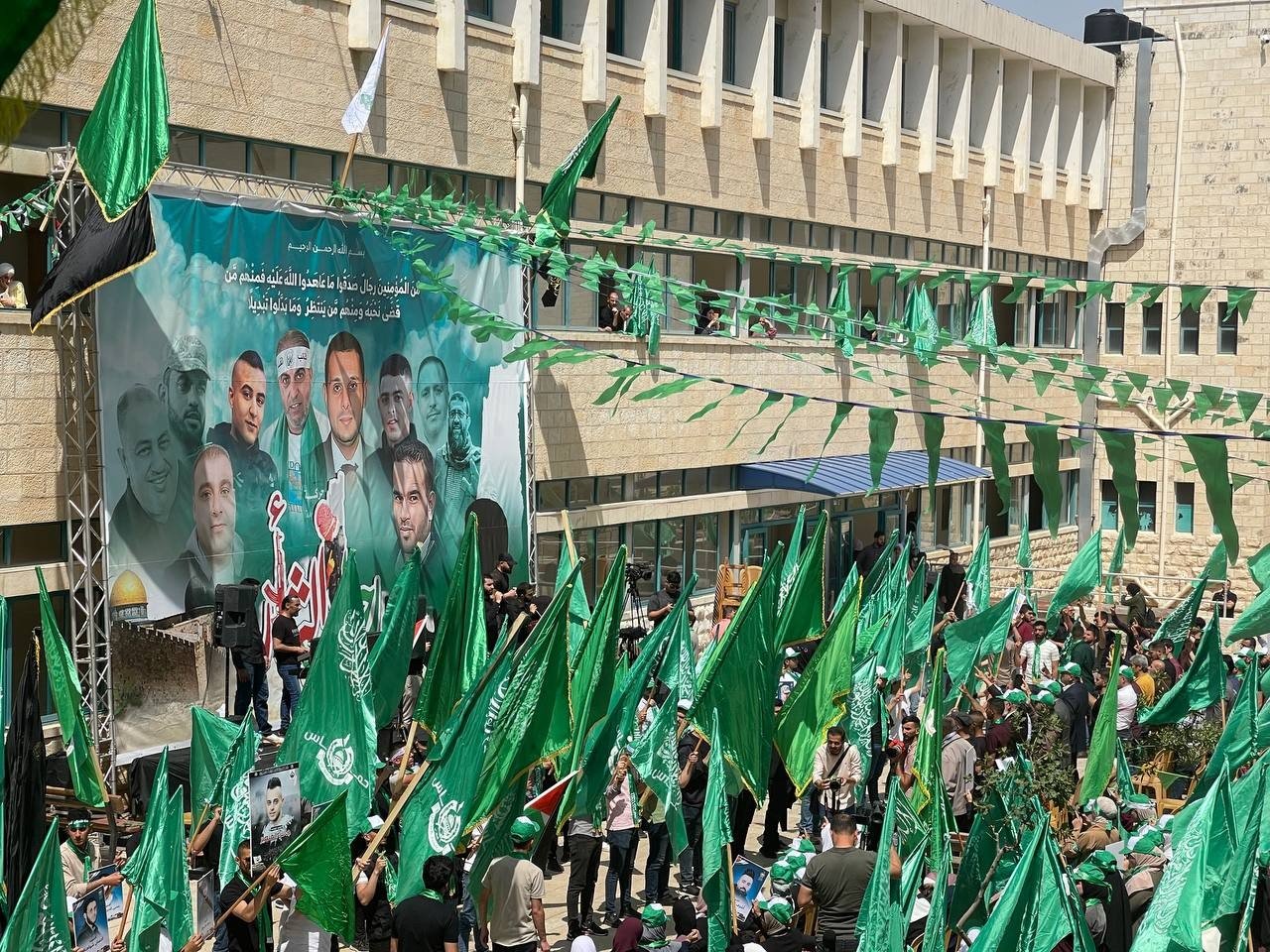 وتزين المهرجان برايات حماس الخضراء وصور شهداء نابلس وأبطالها، وسط حضور حشد كبير من طلبة الجامعة وأهالي الشهداء وشخصيات وطنية.