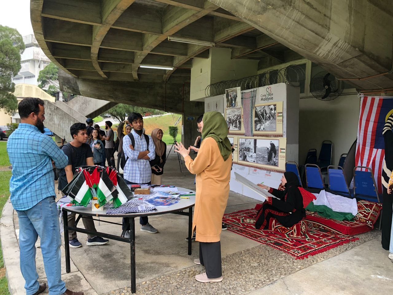 وشمل المعرض الذي حضره شخصيات بارزة ووازنة في ماليزيا، 4 زوايا، الزاوية الأولى، خصصت لنشر عشرات الصور التي توثق النكبة الفلسطينية عام 1948 والتهجير، تم عرضها على نموذج مجسم لجدار الفصل العنصري، وخصصت الزاوية الثانية لعرض المنتجات الفلسطينية وكل ما يرمز للقضية الفلسطينية مثل الكوفية، ومجسمات خشبية لخارطة فلسطين.
