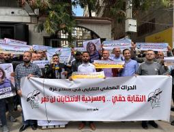 تظاهر صباح اليوم الأربعاء المئات من الصحفيين والصحفيات ضمن الحراك الصحفي النقابي الفاعل، أمام قصر العدل في مدينة الزهراء جنوب محافظة غزة، رفضا للمسرحية الانتخابية التي يمارسها خاطفي نقابة الصحفيين الفلسطينيين.