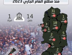 وأشارت إلى أن 34 شهيدًا ارتقوا بسبب القصف (الإسرائيلي)، إلى جانب الأسيرين خضر عدنان وأحمد بدر أبو علي بسبب الإهمال الطبي، و116 مواطنًا بالرصاص الحي، شهيدين "بحروق"، وآخر بسبب الإصابة بالشظايا وشهيد اختناقًا بالغاز السام.