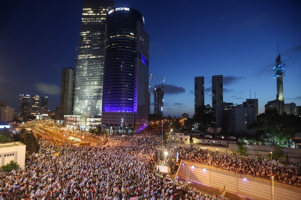 شارك عشرات الآلاف السبت، في المظاهرة المركزية في شارع "كابلان" بتل أبيب ضد حكومة نتنياهو وخطة إضعاف جهاز القضاء الرامية إلى تقويض صلاحيات المحكمة العليا.