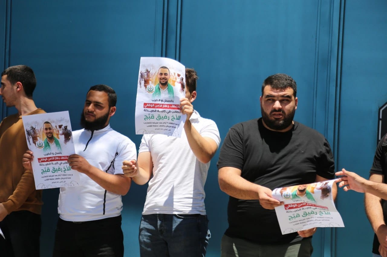 وشاركت كتل طلابية عدة بينها الكتلة الإسلامية في الوقفة الاحتجاجية، المنددة باعتقال أجهزة أمن السلطة للطالب رفيق قبج.