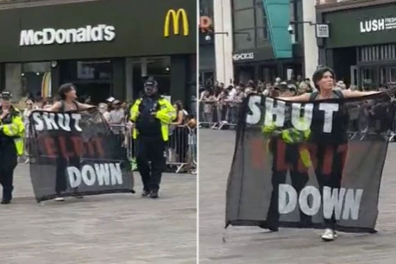 وحملت الناشطة لافتة سوداء كبيرة كُتب عليها “أغلقوا إلبيت” (Shut Down Elbit)، وهو مصنع أسلحة (إسرائيلي) له أفرُع عدة في مدن المملكة المتحدة، ويواجه حملات ضغط منذ سنوات عدّة لإجباره على إغلاق أفرعه.