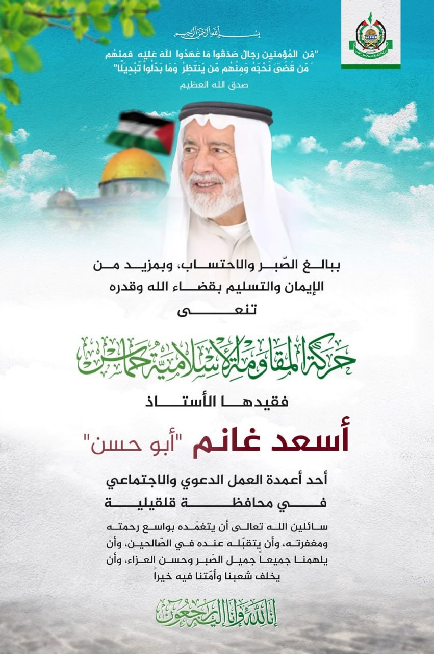 نعت حركة حماس الشيخ الداعية أسعد غانم "أبو حسن" من قلقيلية، الذي توفي مساء أمس عن عمر يناهز ٨٤ عاما.