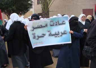 مئات "المناديل" أغطية الرؤوس اصطفت بجوار شعارات كتب عليها "عادت مصر عربية حرة-بالأمس تونس واليوم مصر وغدا ..؟ " .